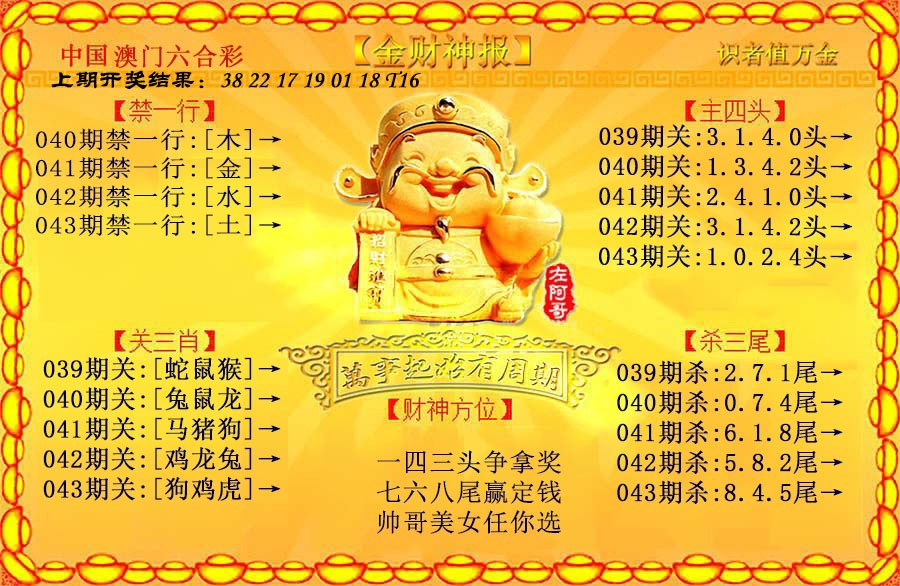 | 038期 | 猴鸡羊狗鼠兔 | 开:鼠42中 |