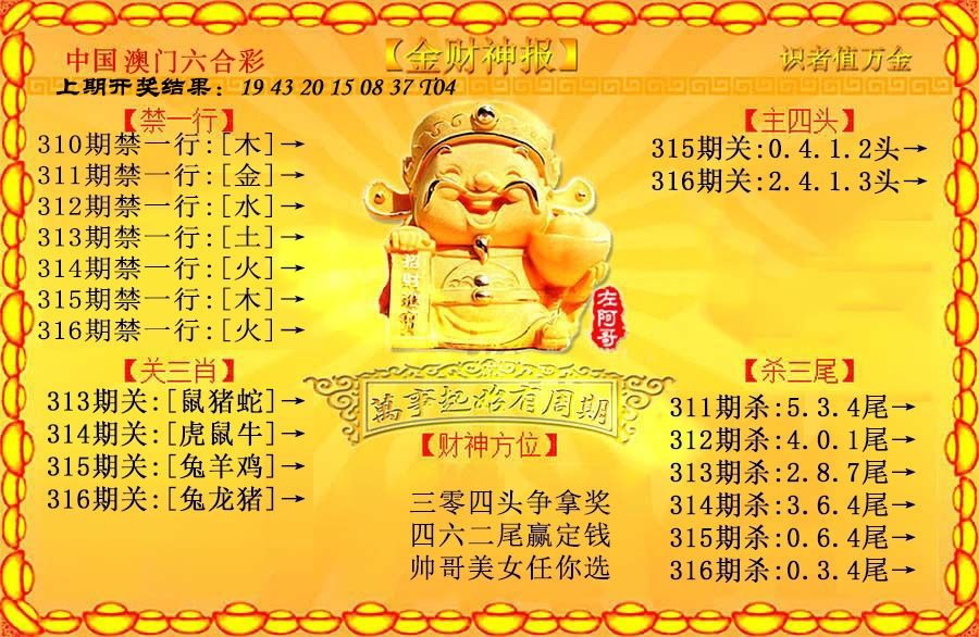 | 315期 | 30-40 | 三尾 | 大数 | 3头 | 虎04 |